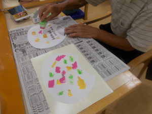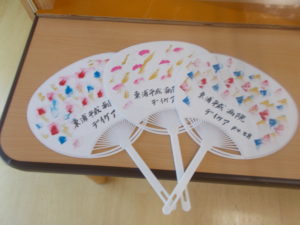 今月のレク作品は 夏にぴったりのうちわ作りです(^^♪ スポンジに絵の具を付けて 叩いていく作業( *´艸`) 金魚を思い思いに貼って完成です。 見ているだけで 涼しげなうちわになりました。 皆さん仰ぎながら 自分で作ったうちわに大満足のようでした(*^▽^*)