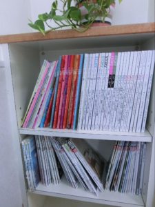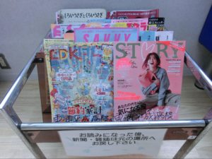 また、ソファの近くにはところどころに本立てもあり、さまざまな雑誌が置いてあります