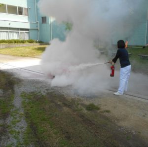 営繕による取り扱い説明の後、実際に消火器をもって火に向かって消火をしてみましたが、