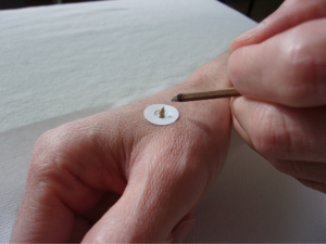 灸点紙というシールを肌に貼り、その上に米粒の半分ほどの大きさのもぐさを置いて燃焼させる方法(透熱灸)と、