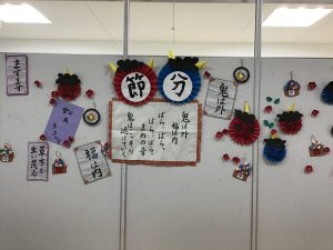 2026年早いものでもう2月が終わろうとしていますね(^^)デイケアでは2月イベントとして無病息災を願い豆まきをしました。2月壁画は利用者さんが作成したものです。可愛い壁画が出来上がりました。 本年も東浦平成病院デイケアをよろしくお願いいたします。