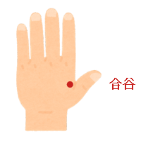 ・合谷(ごうこく)・・・手の甲側。人差し指と親指の骨が合わさるくぼみ。