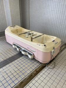 ③機械浴は、寝たきりで過ごされている方、人工呼吸器を装着されている方、普段車いすで過ごされている方で座位保持が不安定でチェアー浴では不安のある方が使用されます。