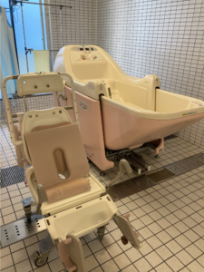 ②チェアー浴は、普段車いすで過ごされておられる方で座位保持能力、下肢筋力がある方が使用されます。