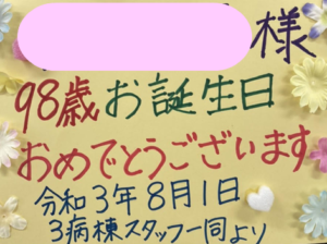 私たち介護士は、患者様に少しでも笑顔になっていただけるよう 誕生日月になると、一人ひとりにバースデーカードを作成し お渡ししています🌼 こんな感じです(*^^*) 患者様にとても喜んでいただけるので、 職員も毎月作成が楽しみです♪ 同じ毎日を繰り返しになりがちな入院生活を 少しでも楽しんでいただけるように工夫をしています。 今後も このホームページを通して発信していきます(^^)/ お楽しみに~🌼