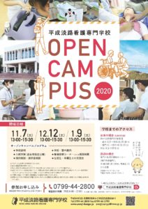 平成淡路看護専門学校 2021年度オープンキャンパス(11月・12月・1月)開催! 参加受付中! お申し込みはお電話 0799-44-2800 まで! ※お電話かWEB からお申し込みください。 詳細はこちら (クリックで拡大表示されます)