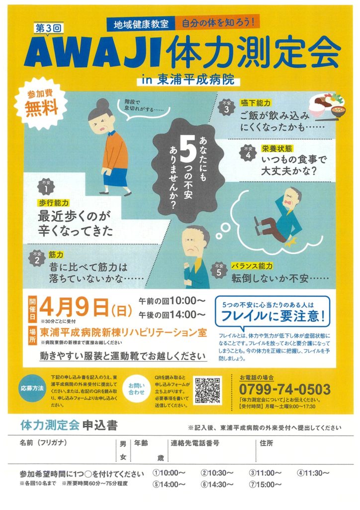 4月9日(日)に東浦平成病院新棟リハビリテーション室にて体力測定会を行います。